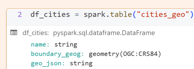 Notice that our datatype displays as CRS84 in the interface, but after saving in Unity Catalog, it appears as GEOMETRY(4326). Databricks is making an effort to educate users about the relationship between CRS84 and SRID 4326.
