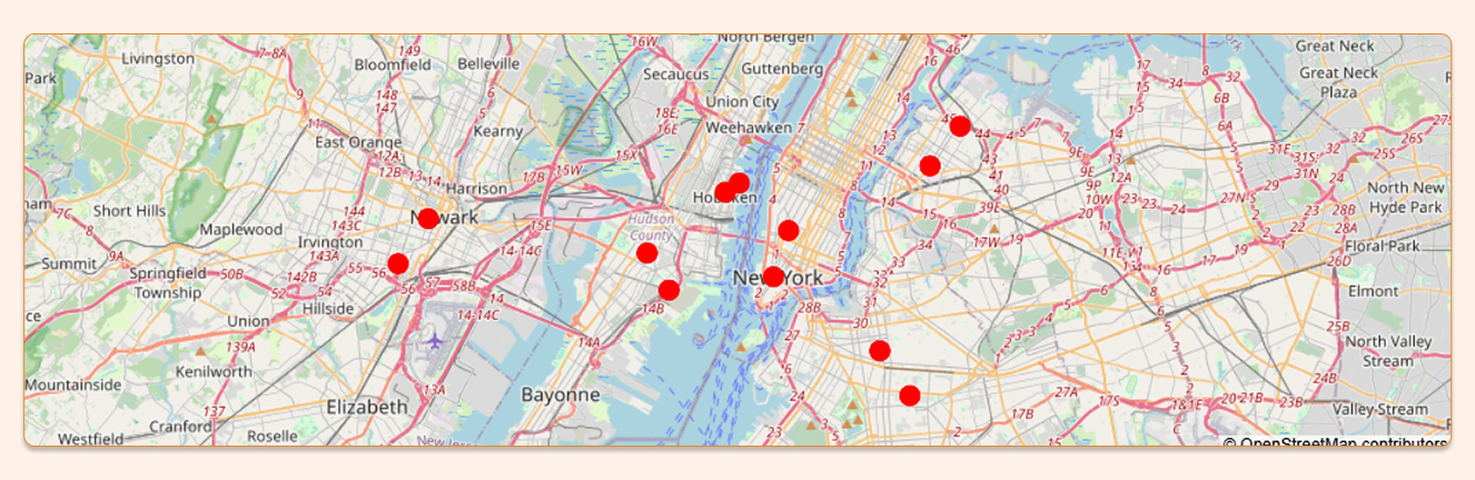 CREATE OR REPLACE TEMP VIEW deliveries_geo AS SELECT CAST(id AS INT) AS id, CAST(lon AS DOUBLE) AS lon, CAST(lat AS DOUBLE) AS lat, ST_POINT(lon, lat, 4326) AS pt_geog -- GEOGRAPHY data type FROM VALUES (1, -74.0080, 40.7130), (2, -74.0005, 40.7305), (3, -74.0710, 40.7220), (4, -74.0600, 40.7080), (5, -74.0320, 40.7450), (6, -74.0250, 40.7485), (7, -74.1800, 40.7350), (8, -74.1950, 40.7180), (9, -73.9550, 40.6850), (10, -73.9400, 40.6680), (11, -73.9300, 40.7550), (12, -73.9150, 40.7700) AS t (id, lon, lat);
