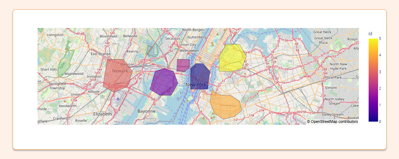 CREATE OR REPLACE TEMP VIEW cities_geo AS SELECT name, ST_GEOMFROMTEXT(wkt, 4326) AS boundary_geog, -- 4326: Spatial Reference System Identifier ST_ASGEOJSON(boundary_geog) AS geo_json FROM VALUES ('New York (Manhattan S)', 'POLYGON((-74.0180 40.7050,-74.0175 40.7400,-74.0060 40.7480,-73.9900 40.7480,-73.9750 40.7350,-73.9800 40.7050,-74.0180 40.7050))'), ('Jersey City', 'POLYGON((-74.1070 40.7050,-74.0950 40.7350,-74.0750 40.7400,-74.0550 40.7350,-74.0450 40.7150,-74.0600 40.6950,-74.0850 40.6950,-74.1070 40.7050))'), ('Hoboken', 'POLYGON((-74.0480 40.7350,-74.0465 40.7550,-74.0200 40.7550,-74.0200 40.7400,-74.0300 40.7350,-74.0480 40.7350))'), ('Newark', 'POLYGON((-74.2100 40.7100,-74.2000 40.7550,-74.1650 40.7550,-74.1450 40.7350,-74.1550 40.7100,-74.1850 40.7000,-74.2100 40.7100))'), ('Brooklyn (Central)', 'POLYGON((-73.9700 40.7050,-73.9650 40.7000,-73.9500 40.6950,-73.9300 40.6950,-73.9100 40.6850,-73.9050 40.6700,-73.9200 40.6600,-73.9450 40.6550,-73.9650 40.6650,-73.9750 40.6850,-73.9700 40.7050))'), ('Queens (LIC/Astoria)', 'POLYGON((-73.9550 40.7350,-73.9550 40.7600,-73.9400 40.7800,-73.9100 40.7800,-73.8950 40.7600,-73.9050 40.7400,-73.9250 40.7350,-73.9550 40.7350))') AS t(name, wkt);
