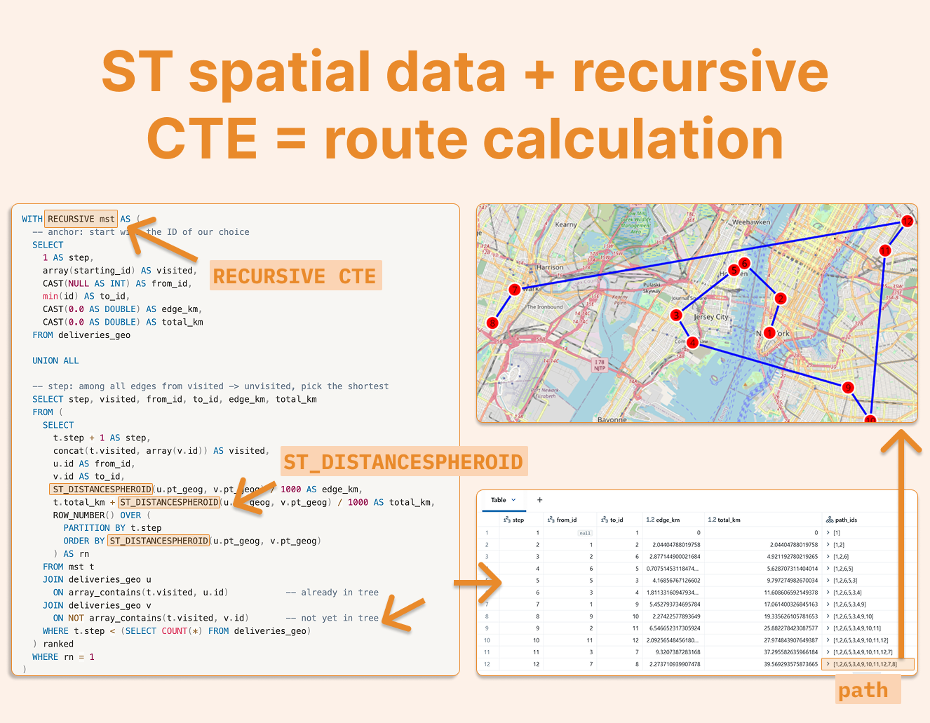 For those interested in more complex applications, here's a sophisticated example that combines Databricks' new recursive CTE functionality with geospatial functions to implement Prim's algorithm for building a minimum spanning tree of delivery points:
