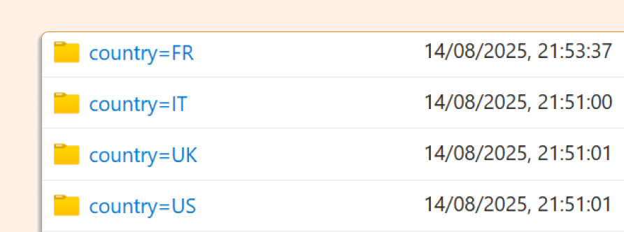 CREATE TABLE students (name STRING, country STRING) PARTITIONED BY (country); -- Insert initial data into US, UK, and IT partitions INSERT INTO students VALUES ('Dylan', 'US'), ('Doug', 'UK'), ('Julia', 'IT');