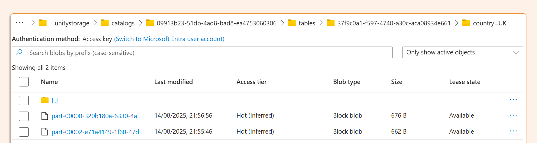 Examining the UK folder, we see a new parquet file that overwrites the old one. Since this is a Delta table and we maintain Delta history, the old parquet file remains alongside the new one:
