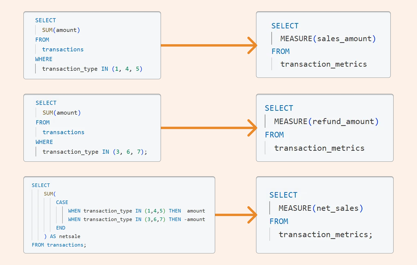 SELECT MEASURE(sales) FROM transactions # instead of SELECT SUM(amount) FROM transactions WHERE transaction_type IN (1,4,5) SELECT MEASURE(refunds) FROM transactions # instead of SELECT SUM(amount) FROM transactions WHERE transaction_type IN (3,6,7) SELECT MEASURE(netsale) FROM transactions # instead of # SELECT # SUM( # CASE # WHEN transaction_type IN (1,4,5) THEN amount -- sales # WHEN transaction_type IN (3,6,7) THEN -amount -- refunds # END # ) AS netsale # FROM transactions;