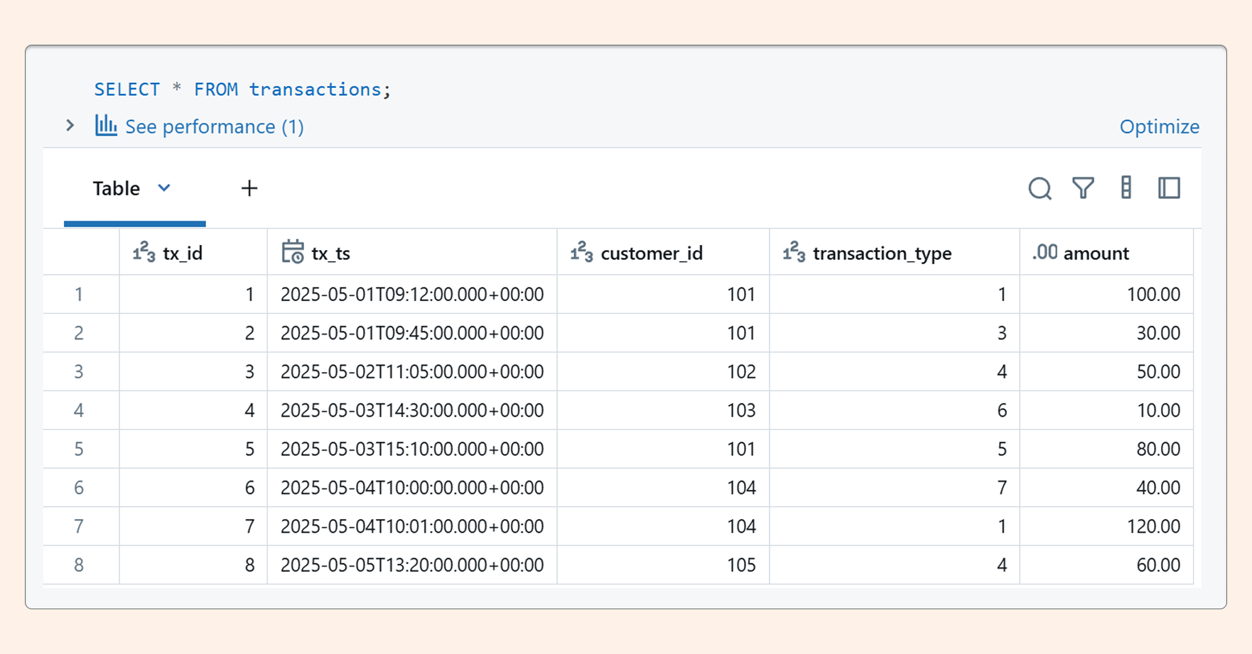 Our transactions table, for which we'll define metrics, looks like this: