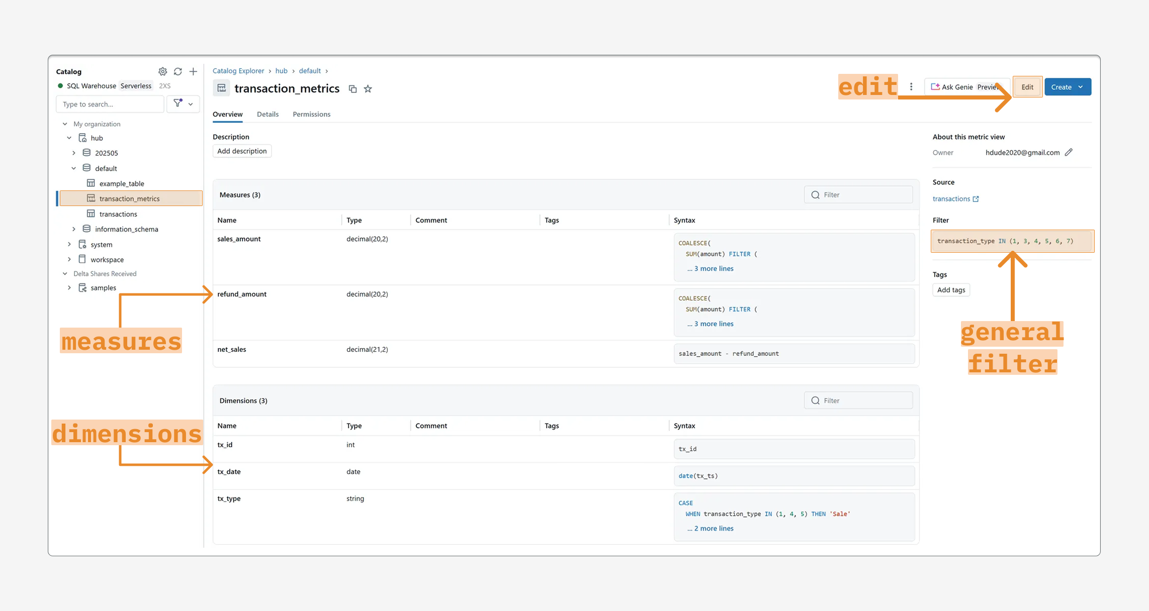 Source: The source data for the metric view. This can be a table-like asset or a SQL query.