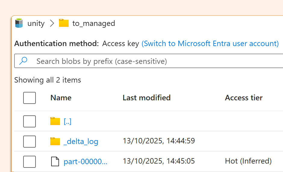 But if we run the DESCRIBE command or look in Unity Catalog, we can see that files have been moved to the schema (or catalog) managed location by running: